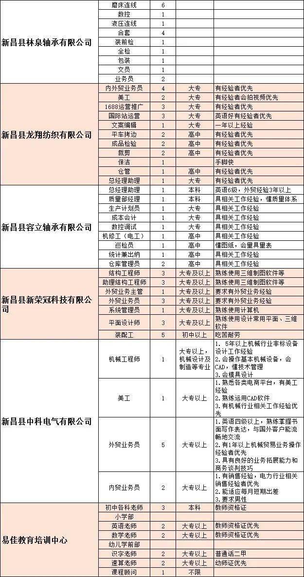 本文將為您詳細介紹新昌縣各大企業(yè)的招聘概況,包括崗位名稱(chēng)、招聘人數、任職要求以及薪資待遇等,讓您對當地就業(yè)市場(chǎng)有更全面的了解。